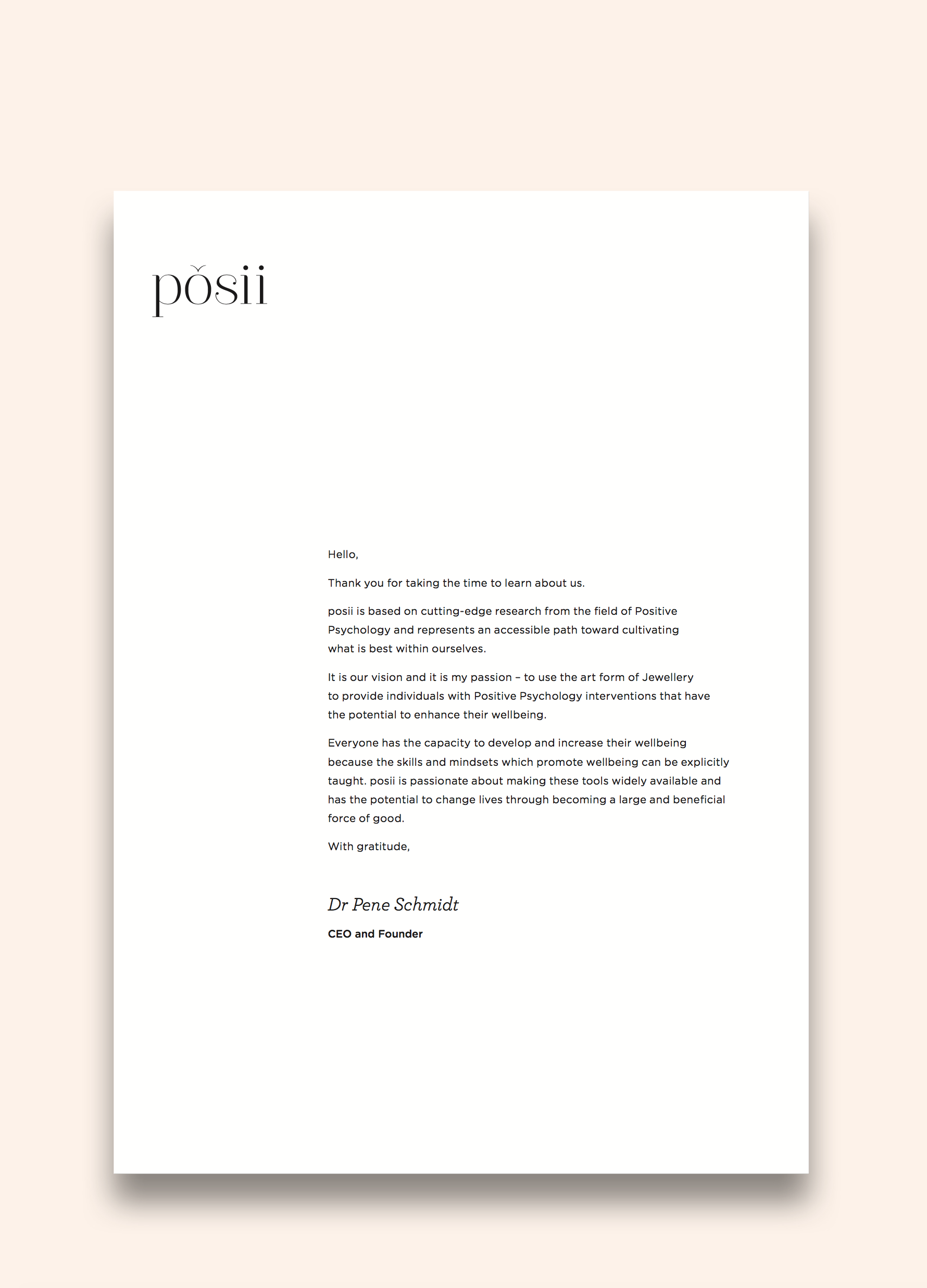 “I strongly believe that evidence-based information and wellbeing tools should be accessible to everyone. That’s why I created posii. After seeing thousands of patients and students really thrive with positive psychology interventions, I began to envision a jewellery brand that made these ideas widely available – jewellery that you could touch, be empowered by, and carry with you always. I’d had the idea for a number of years, and prior to his death my much-loved brother had always urged me to “just give it a go”. But at the time, I don’t think I really believed it was possible. After his death, everything changed, and any hesitations or doubts that I may have previously had suddenly became insignificant. I suddenly thought ‘Why not!?’. And so the posii journey began”
